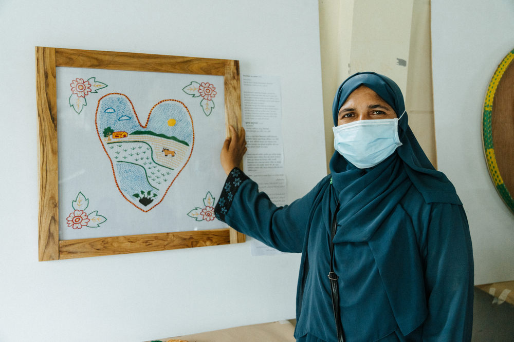 Broderie : Senu Anara est une brodeuse connue pour ses taies d'oreiller, ses robes et ses lungis. La broderie a une signification profonde dans le camp, car chaque pièce contient une histoire et des souvenirs culturels sous la forme d'une résistance silencieuse. « On n'aurait jamais pensé que les gouvernements de Rakhine et de Birmanie nous chasseraient », dit-elle. « La feuille de taro est notre document. Comme l'eau, on est obligés d'aller ailleurs... Si on montre ça au monde, notre empreinte restera peut-être. »